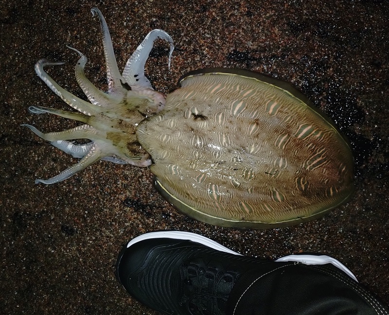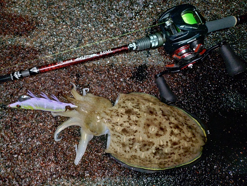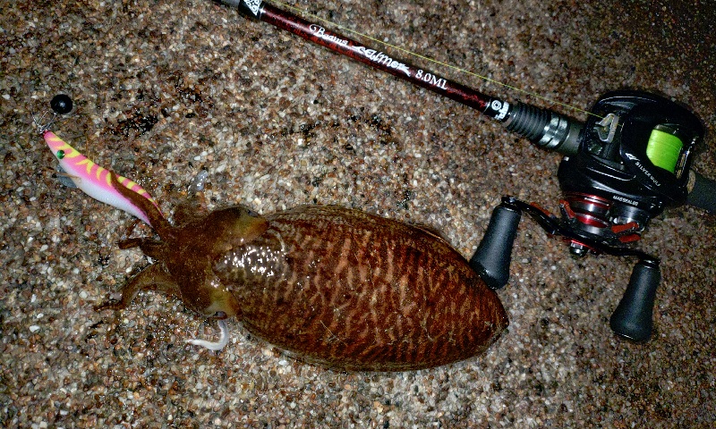 今度はオモリなしのエギングスタイルで、小さいけどモンゴウイカをキャッチ