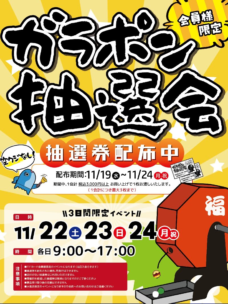 11月22日(土)から11月24日(月)の朝9時から夕方17時の期間、水島店店頭にてガラポン抽選会を開催します。