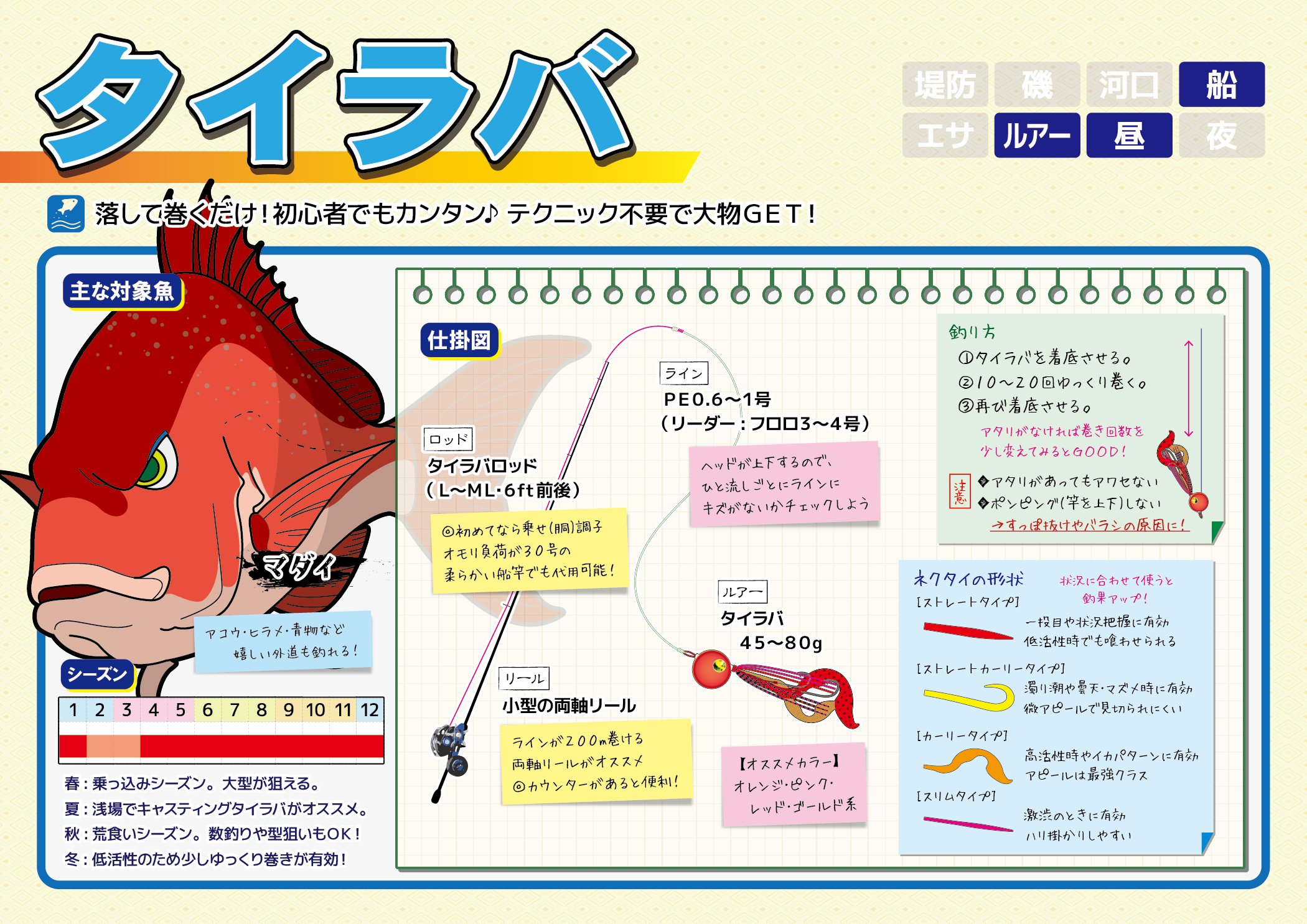 マンボーの釣り教室「タイラバ」 釣り教室 2022.08.102026.02.21 もう瀬戸内の船釣りでは、ど定番のルアーフィッシングとなったタイラバ! 落として巻くだけ!の中に奥深さもあり、一度やったらハマる方続出! ぜひ、お手軽に高級魚マダイをゲットしてください。