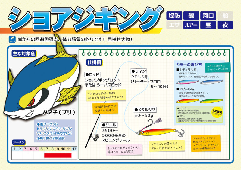 マンボーの釣り教室「ショアジギング」 釣り教室 2022.08.162025.10.10 陸っぱりからジグをぶん投げて、ハマチなどの青物を狙う釣りです。 瀬戸内では、秋ごろになると陸からハマチが狙え、「釣れた」という情報が回ると波止には釣り人があふれかえるほどです。 40㎝~50cmのヤズサイズがアベレージですが、80㎝を超える大物も毎年必ずまざります。 タイムのHPをチェックして、秋は狙ってみよう!
